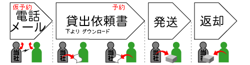 - 「貸出依頼書」を当社よりFAXまたは、下(PDF)よりダウンロードし、必要事項をご記入下さい。